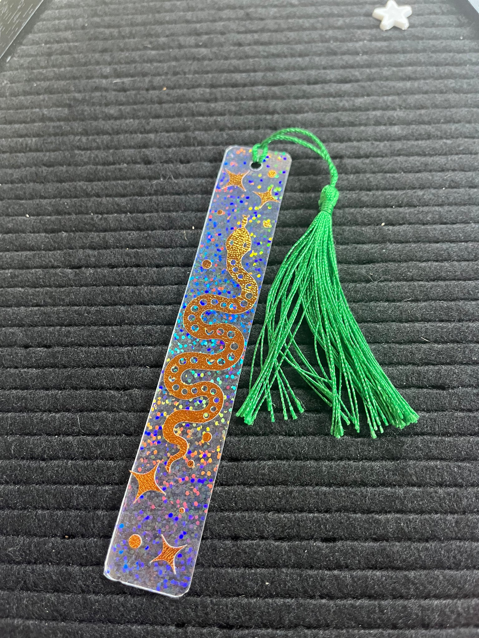 A gorgeous gold snake slithers across sparkles with a ln emerald green hassle