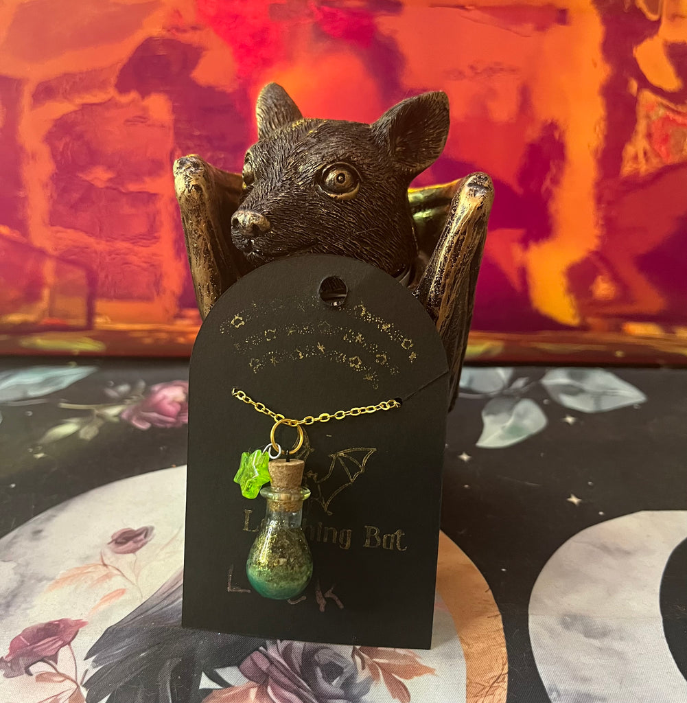 Charmed potion bottle pendants for luck. Filled with herbs, glitter, crystals, resin and a green star charm to call in more luck to your life . Chain length is 18”