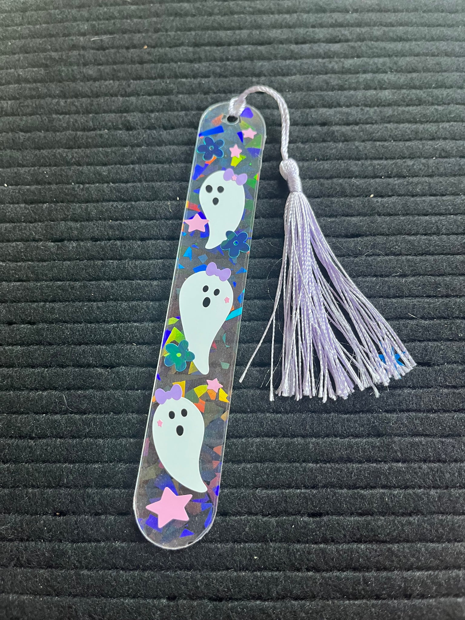 3 cute little ghosties with bows with a holographic background with lavender tassel